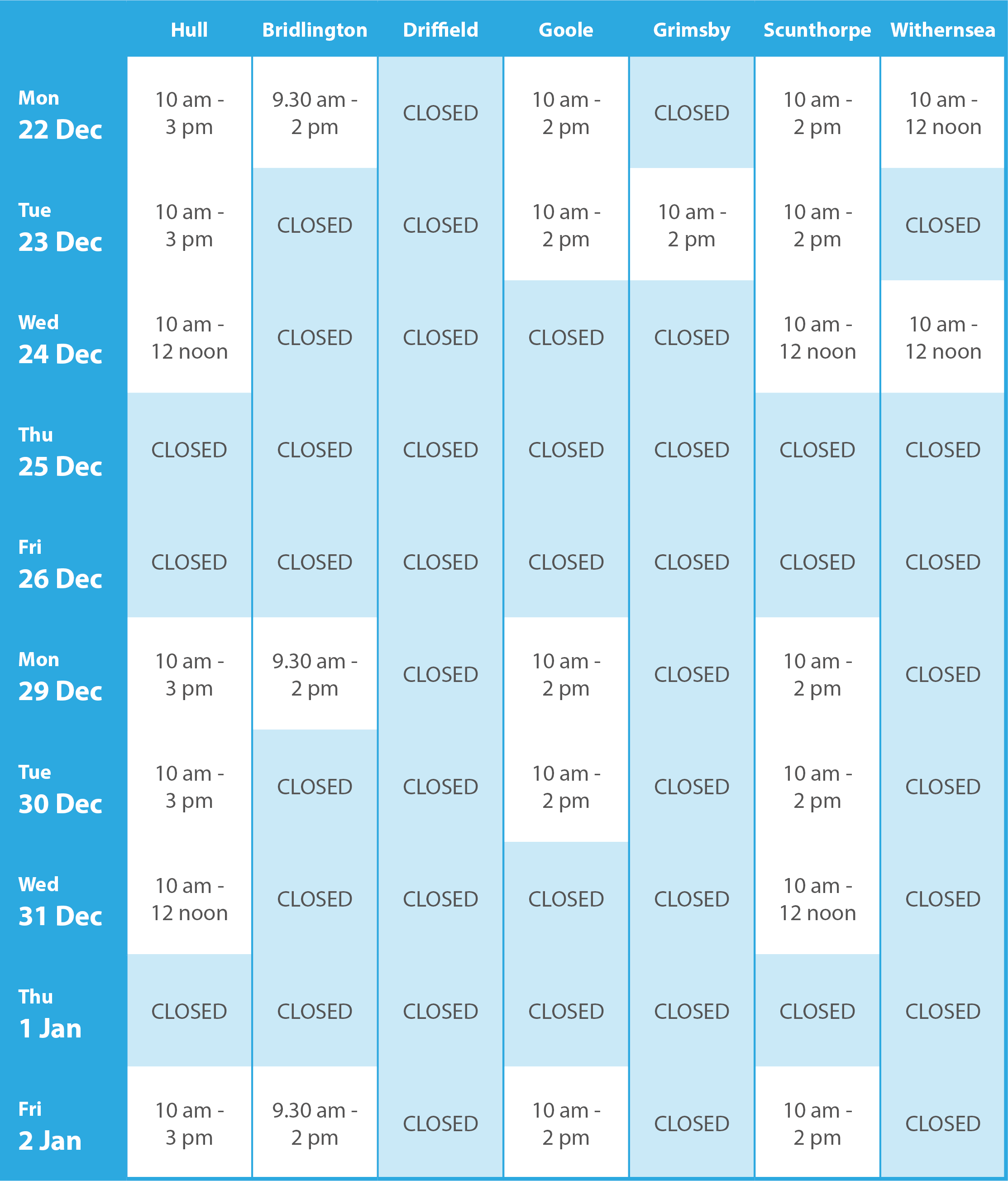 Please take note of our Christmas & New Year Opening Times 2025-26