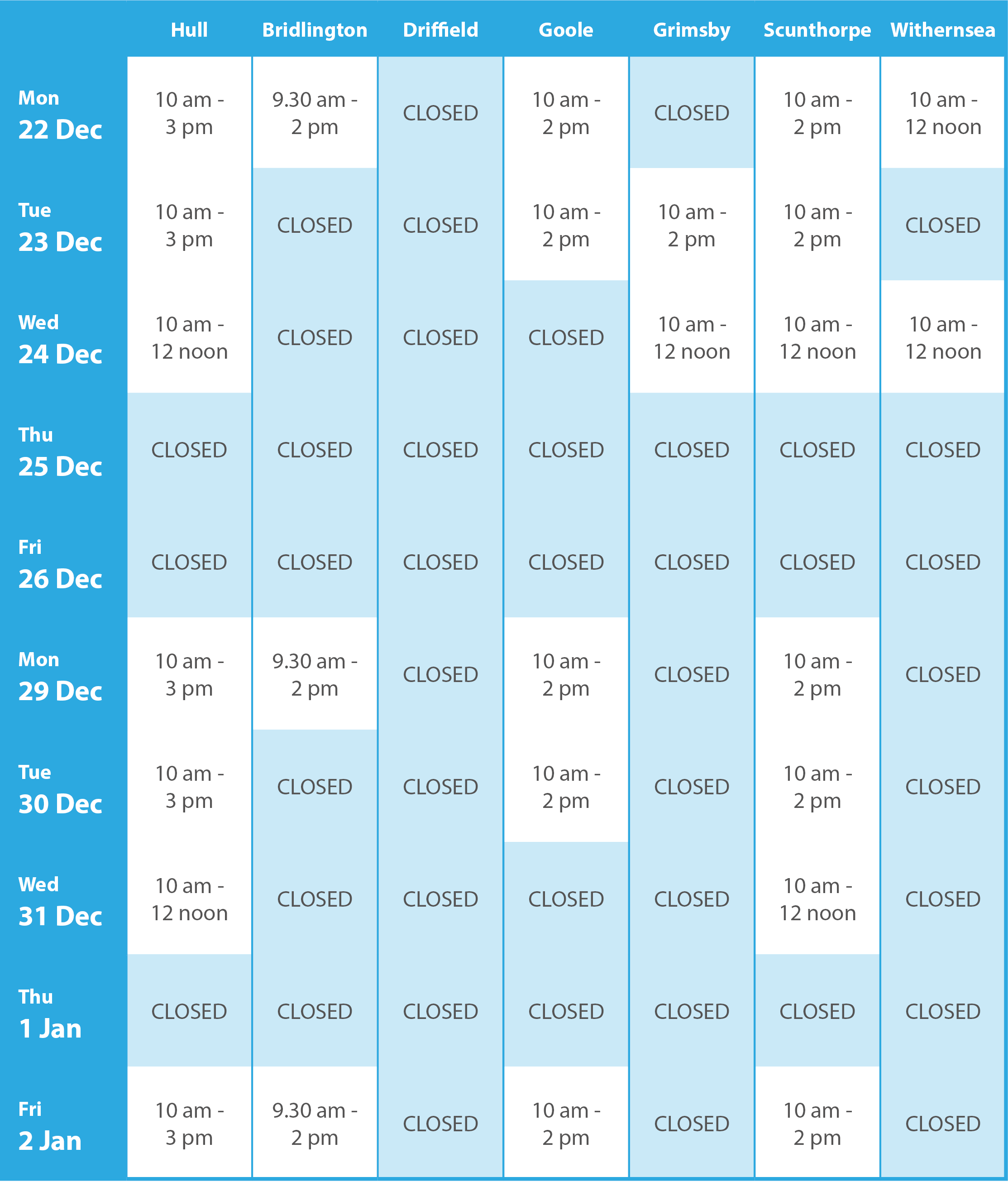 Please take note of our Christmas & New Year Opening Times 2025-26